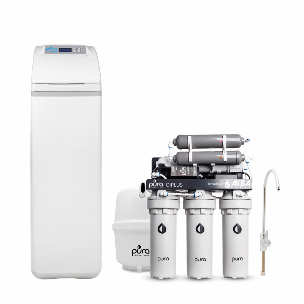 Agua Premium para todo tu hogar. Este dúo es recomendable para zonas tanto de red como especialmente de pozo, donde el agua es pesada, dura y salitrosa. El Ablandador Pura Mediterráneo va a eliminar el sarro de toda tu casa (se conecta al ingreso de agua) protegiendo cañerías, griferías y electrodomésticos, además que cuida tu piel y cabello a la hora de la ducha, dejándolo más suave. Sumando la Planta purificadora de Ósmosis Inversa Pura Antártico, vas a obtener agua premium para beber, cocinar y mas, eliminando todos los contaminantes del agua como arsénico, metales pesados, nitritos y nitratos, flúor, cloro, entre otros (se conecta bajo mesada en la cocina).