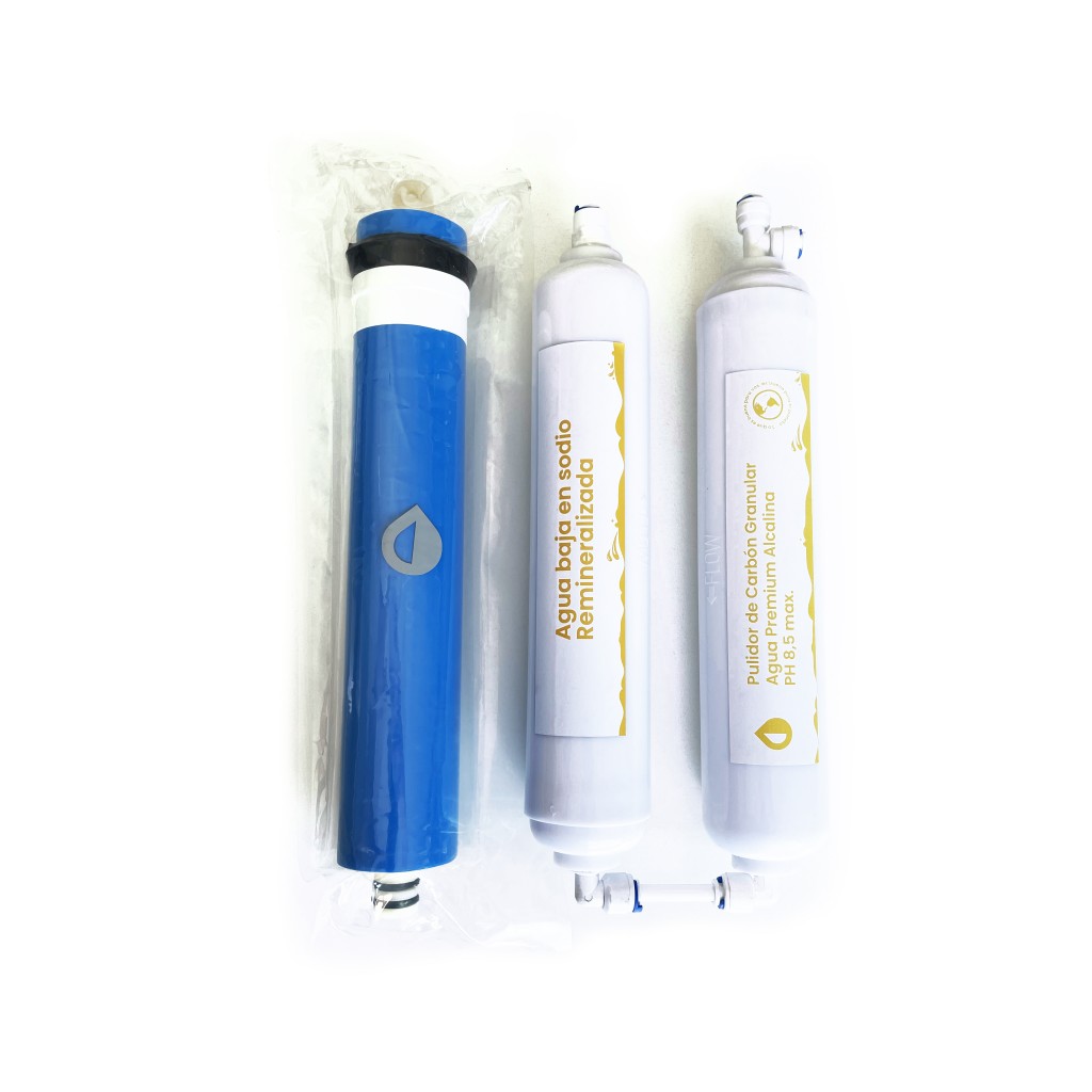 El Pack 2 Crystal es el kit de mantenimiento cada tres años de tu Planta Purificadora Antártico. Se recambian estas tres fases de tratamiento compuestas por membrana PURA de ósmosis inversa, un post filtro de carbón activado en bloque y un post filtro remineralizador.