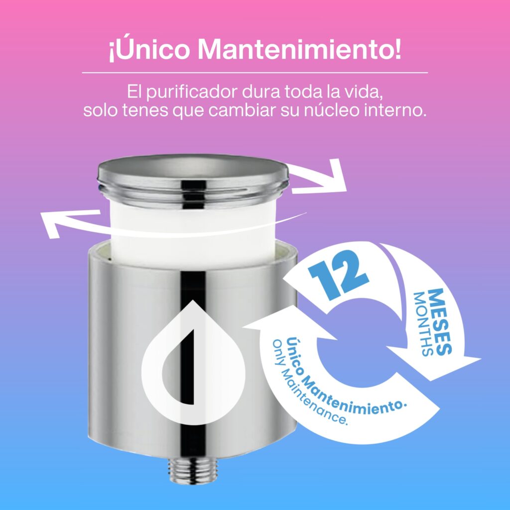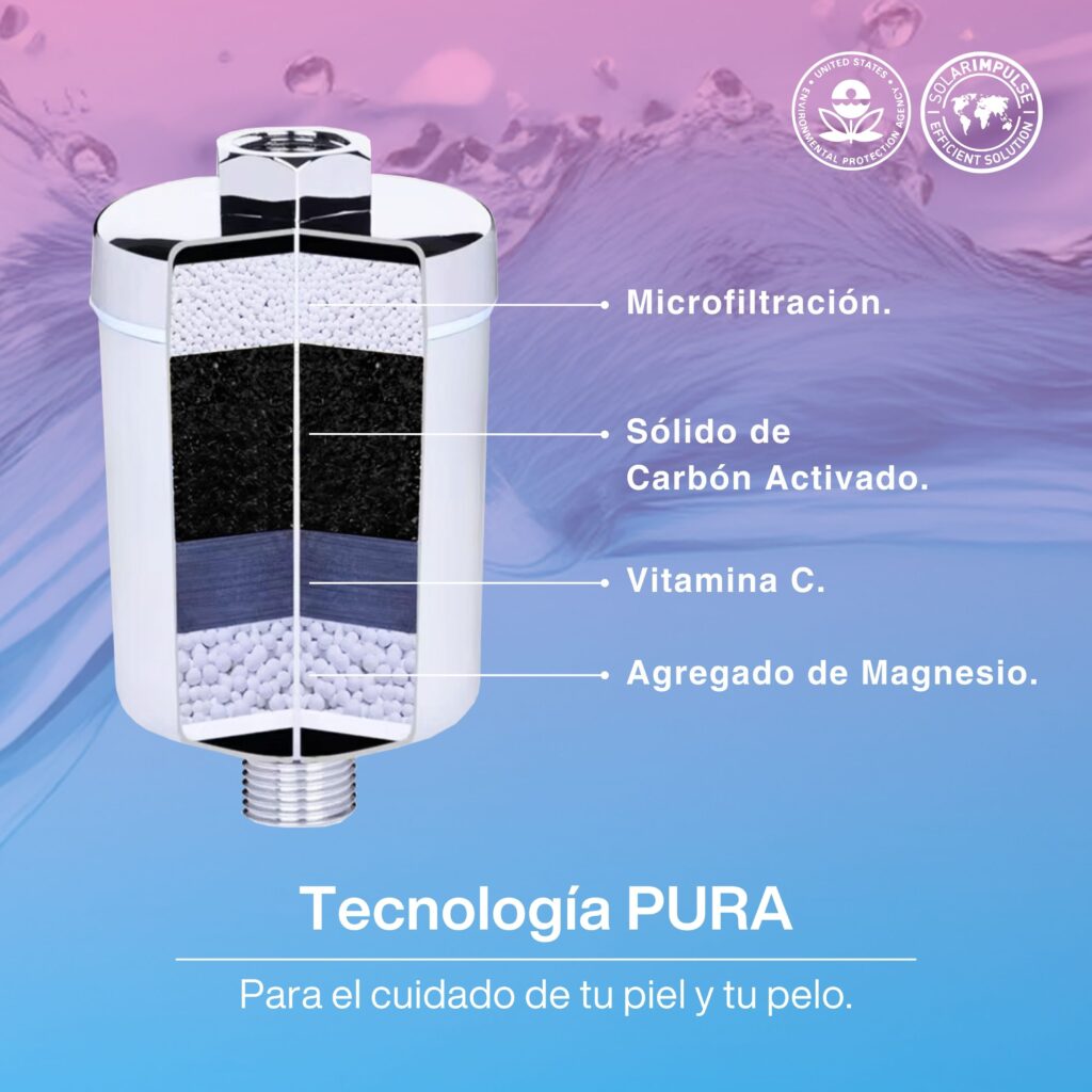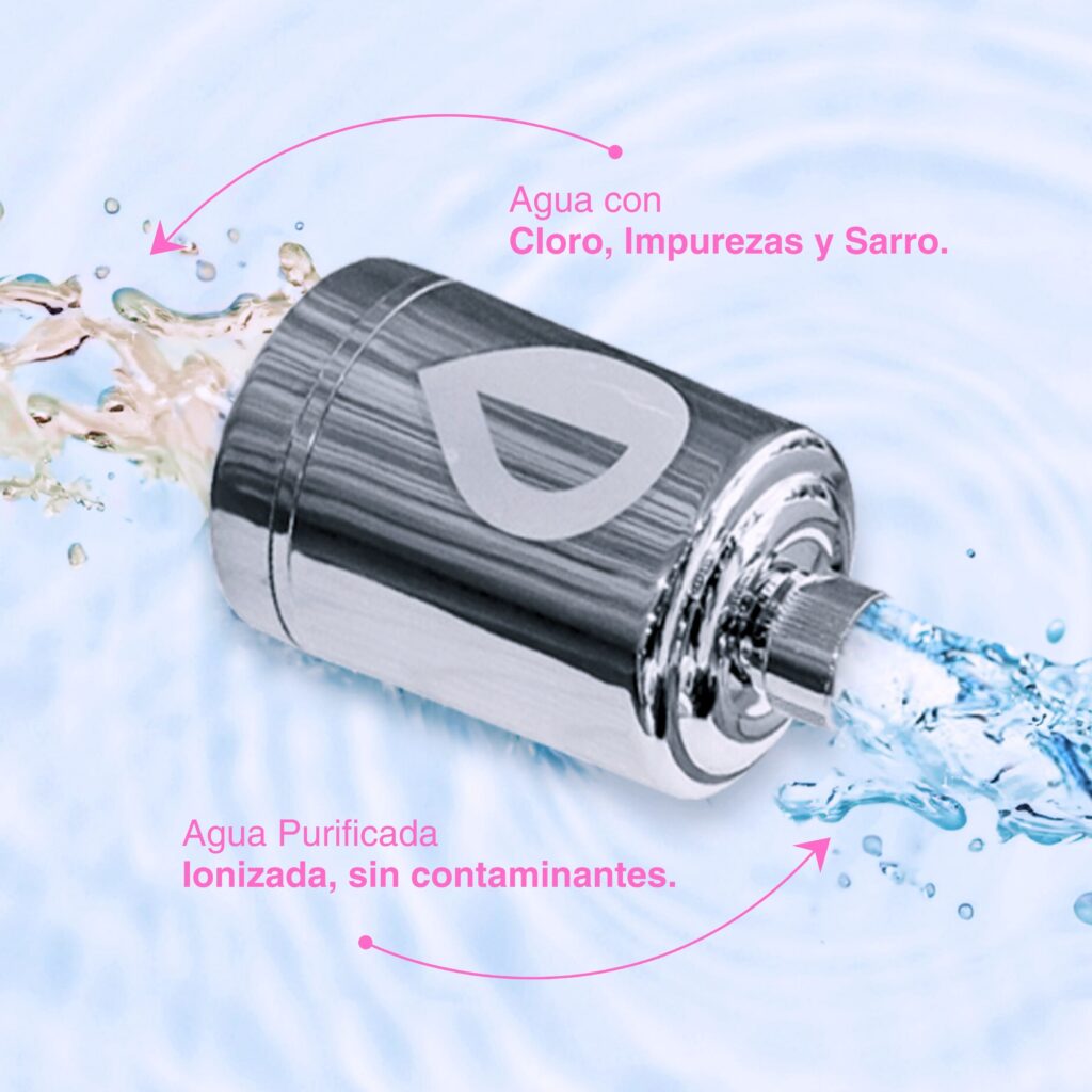 Directo a la flor de tu ducha, de alto caudal, elimina Cloro, impurezas, feo olor y particulas de sarro, prolonga el efecto de tratamientos de cabello, protege la tinta, piel suave protegida con agua purificada, optimiza la efectividad de jabones, shampoo y cremas.