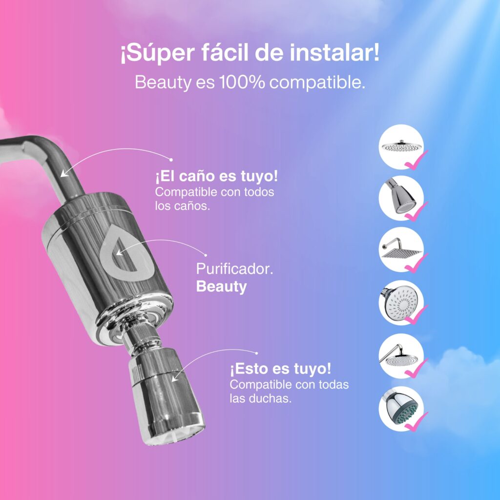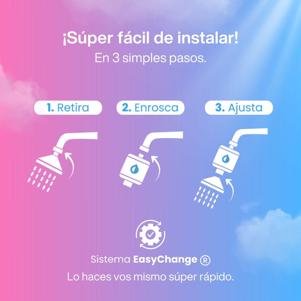 Fácil, Rápido y Seguro. Es súper fácil, te tomará 5 a 10 minutos en hacerlo tu mismo, solo colocas el purificador Pura entre el caño de agua que tienes en la ducha de tu baño y la flor de la ducha que tu tienes.